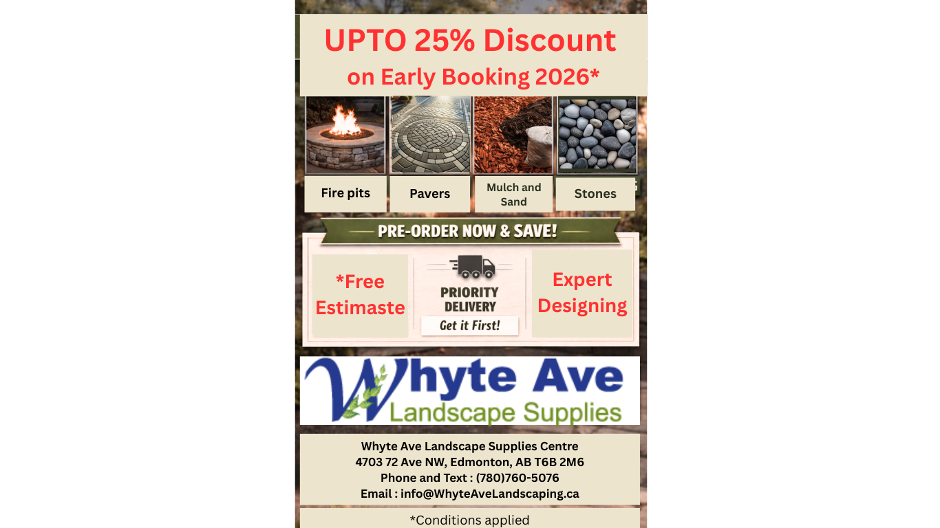 Beat the rush and lock in up to 25% early booking discount on top-quality landscaping materials. Perfect for homeowners, contractors, and garden projects. Stock up on mulch, gravel, pavers, topsoil, and more at unbeatable seasonal pricing. Offer valid for a limited time — reserve today!